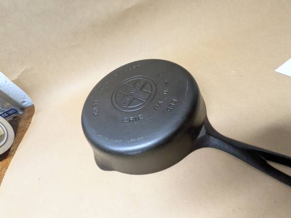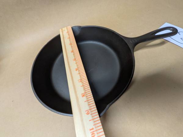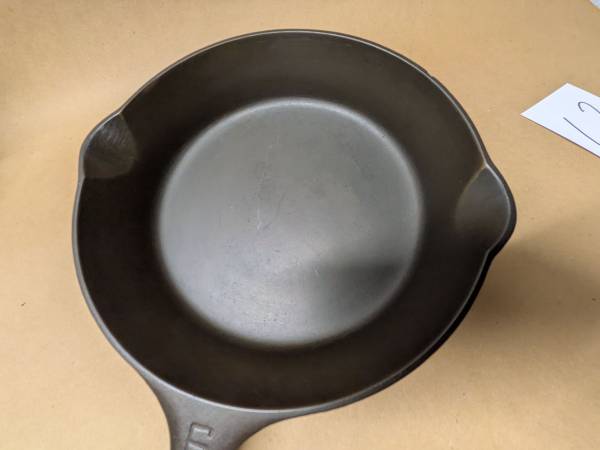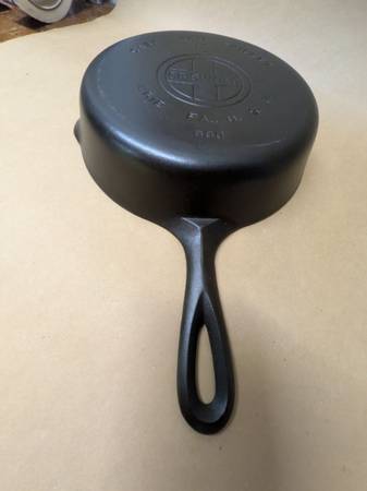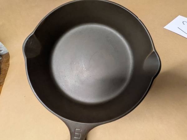 Cast Iron Skillet made by Griswold #6. Perfect for baking cornbread. Does have a wobble and spins. Perfect for camping or display! Please look at the pictures. A name brand associated with Cast Iron!