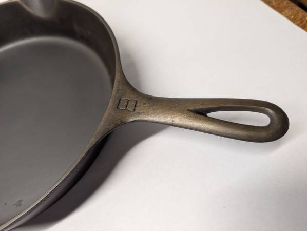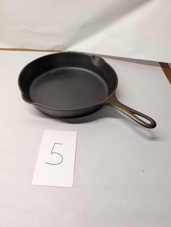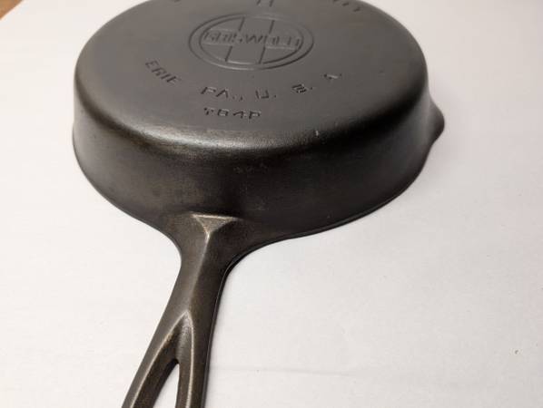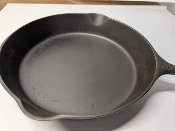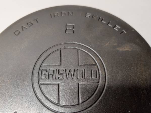 Griswold skillet #8 Nice shape Large logo Sits flat One coat of seasoning Some normal wear, scuffs. Perfect for cooking/baking Will make a great gift Perfect for any household kitchen. Please look...