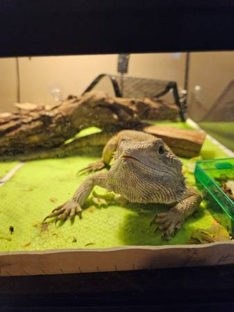 5 year bearded dragon with enclosure. His name is Hank. Great temperament and loves to be held and pet on his head. He is aging so depth perception is a little off when feeding. I tend to baby him and hand feed him to make sure he gets his nutrients but he can eat on his own but takes him a little more time and he gets frustrated. He will come with his tank, heating lamps, temperature gages, light timers, and all decor. He has been a family pet for years but he doesn't get the attention he deserves.