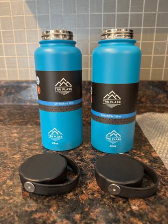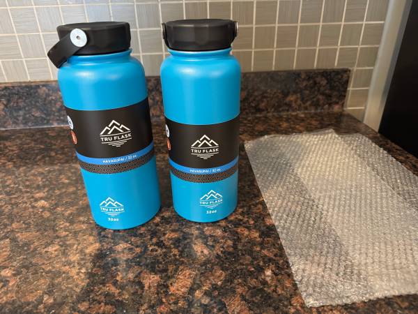 BNIP Tru Flask Water Bottle Set 32oz in Havasupai Blue. Wide mouth, double-wall, vacuum insulation, stainless steel. Eco-friendly, BPA free, hand wash only. Keeps cold up to 24 hrs/hot up to 12hrs. Capacity = 2.5lbs. Dimensions: W = 3.9,” H = 9.96.” Asking $30 obo for the set.