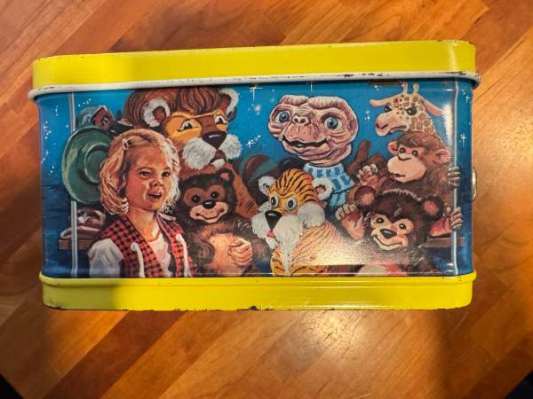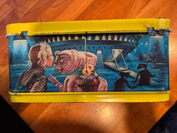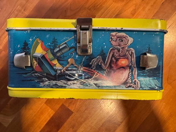 E.T. Lunchbox from 1982. There is some rust and scratches, but overall it is in very good condition. The colors are great and there is no fading. It is missing the handle and thermos. Asking $60 obo.