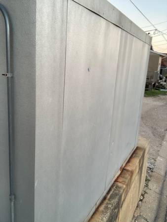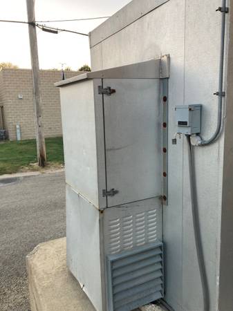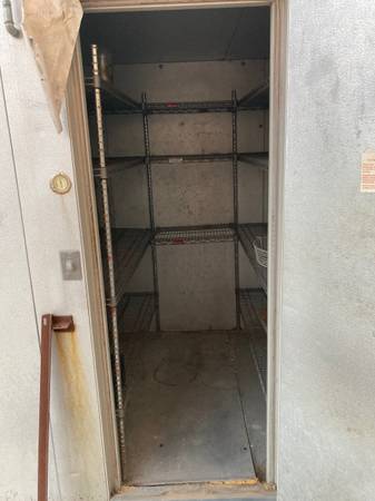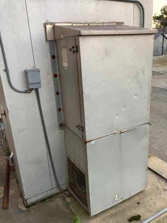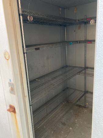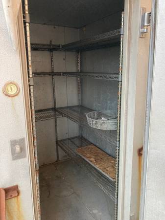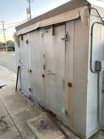 Outdoor walk in cooler/fridge/freezer. Has power supply and both sides will run, but does not cool properly. Overall good shape, but needs attention/parts. Must disassemble and remove.
